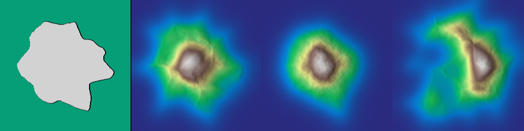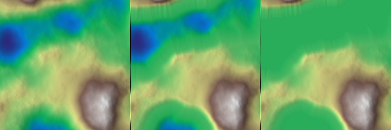 This function applies a warping effect to the input array based on the downward local gradient direction, creating a deflate or inflate effect. The warp amount, pre-filtering radius, and displacement direction can be customized.