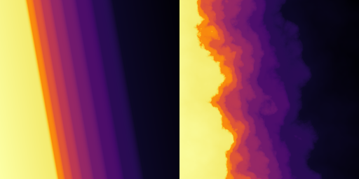This function applies a warping effect to the input array based on the downward local gradient direction, simulating a deflate or inflate effect. The effect can be customized by adjusting the displacement amount, pre-filtering radius, and whether the displacement direction is reversed.